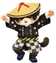 黒地の法被に黒股引、黒足袋といった衣装は野良着を模しています。この法被の素材は、実は絹の羽二重でできており、素朴な見た目の中にも上質な素材を使うという、八尾の文化的な粋(いき)やこだわりを示しているのかもしれません。